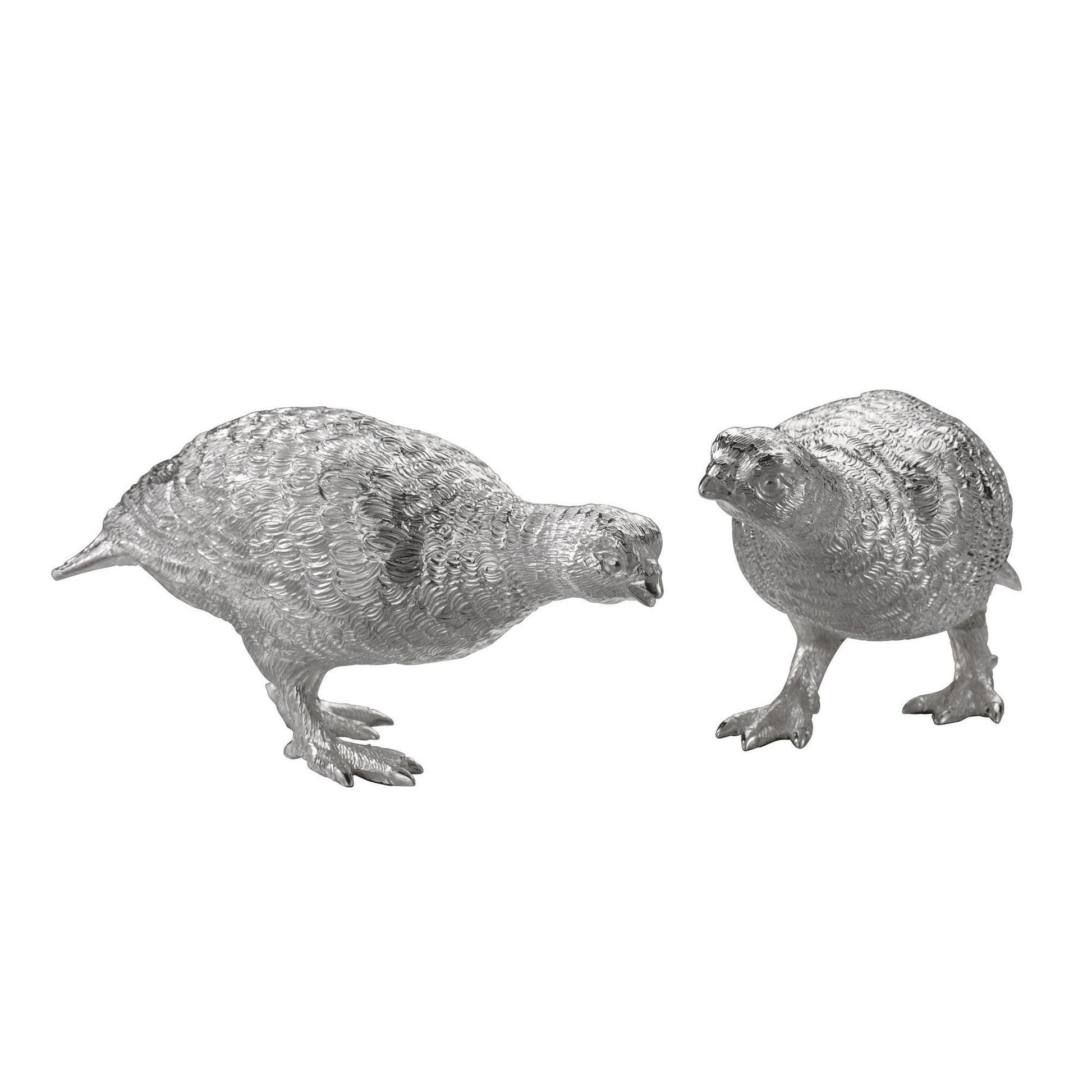 The Grouse pair is hand chased from beak to tail tip and cast in four separate parts of solid silver, moulded using the lost wax process. The details of the birds' feathers are then hand chased to perfection by a skilled hand craftsman, highlighting all its life-like features.